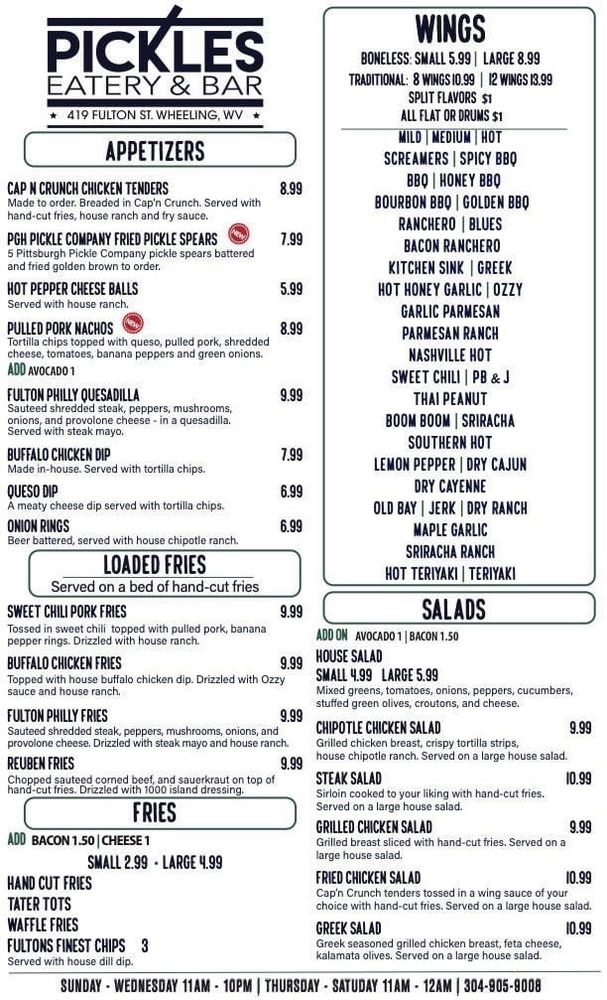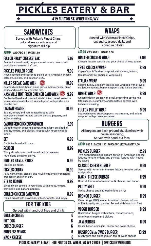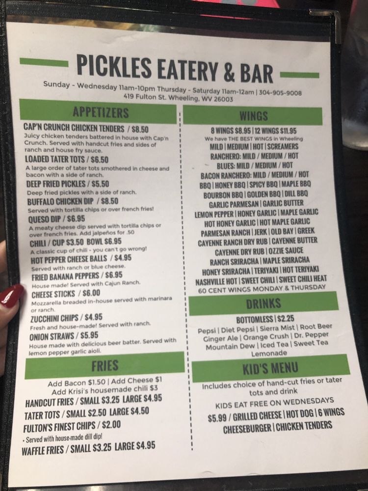 Welcome to Pickles Eatery & Bar, a vibrant American pub located in the heart of Wheeling, WV. This establishment is beloved for its casual atmosphere and a diverse menu appealing to all palates, particularly highlighting its mouthwatering wings and innovative dishes like Captain Crunch breaded chicken tenders.